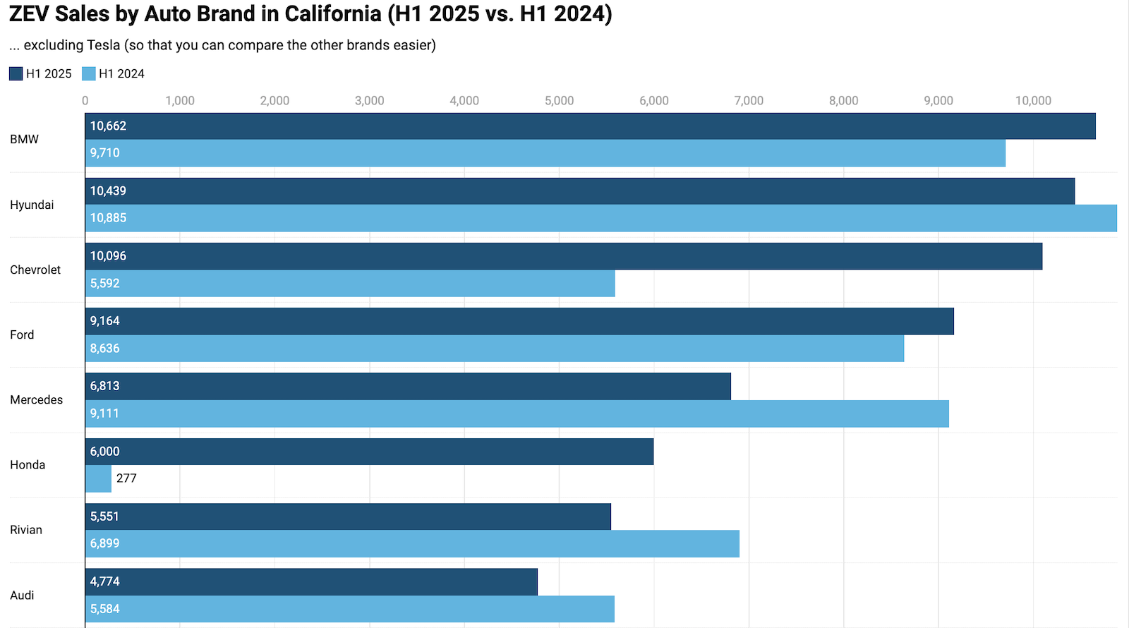 Looking just at ZEV sales, well, no matter how much Tesla drops, it’s got such a massive lead over the rest of the pack that it’s hard to even notice a drop. There’s no chance any other automaker is getting close to the (originally) California brand this year or next. Let’s just see if any other brand can get to 10,000+ ZEV sales a quarter in the coming quarters/years.