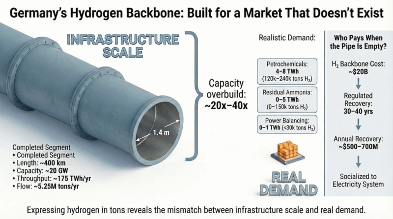 Germany recently completed and pressurized the first roughly 400km segment of its national hydrogen backbone. The pipes are in the ground, the compressors work, and the system is technically ready. There is only one problem. There are no meaningful hydrogen suppliers connected and no material customers contracted. This is not a commissioning delay or a temporary mismatch. It is a structural failure of demand. The reason this matters far beyond hydrogen policy is simple. The cost of this infrastructure will not disappear. It will persist for decades and will be paid for through higher electricity bills.