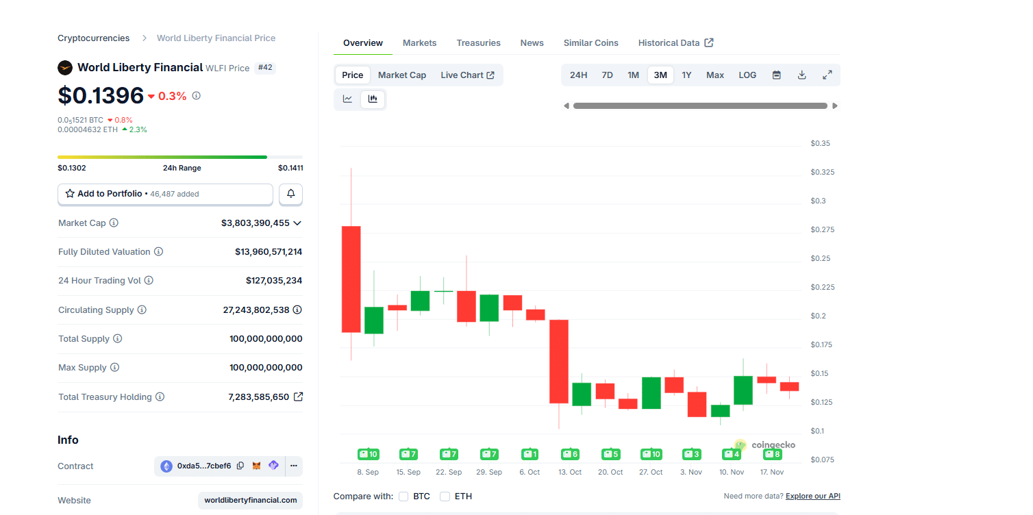As of November 20, WLFI crypto had a market cap of over $3.8Bn, securing a spot in the top 50. On September 1, when it launched, the token initially rose to $0.33, then peaked and crashed nearly 60% to spot rates.