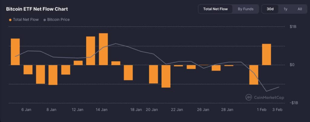 After a week of heavy outflows, BTC spot ETFs flipped back to net inflows.