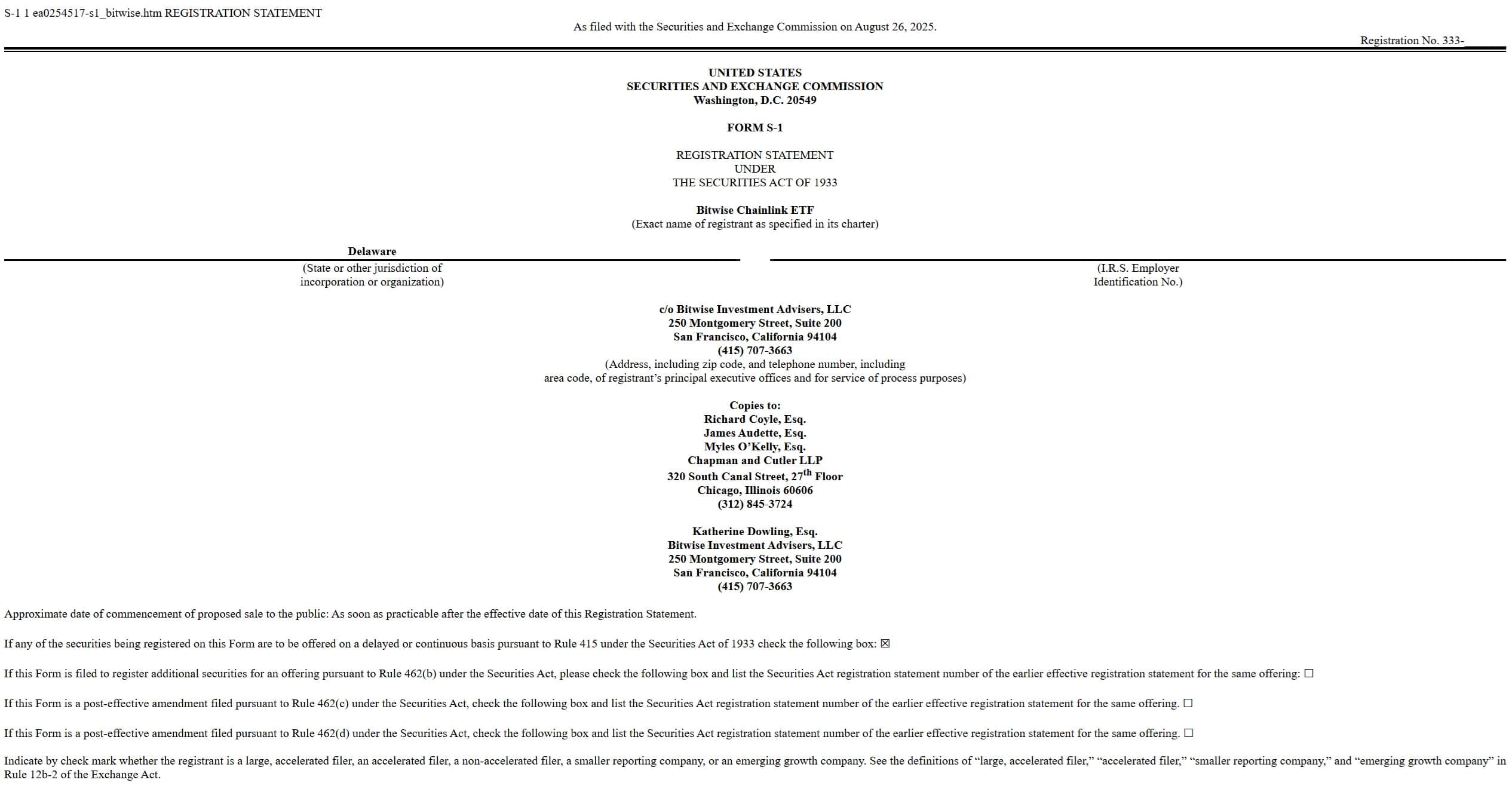 Now that Bitwise has filed its S-1 form, the next step will likely involve a 19b-4 filing and exchange approval. These filings typically move through a review process that can stretch for months. If the ETF gets the green light, it would mark the first time investors in the U.S. could trade a fund tied specifically to Chainlink. With regulatory momentum building and more ETFs being proposed across the crypto space, this filing could land at just the right time.