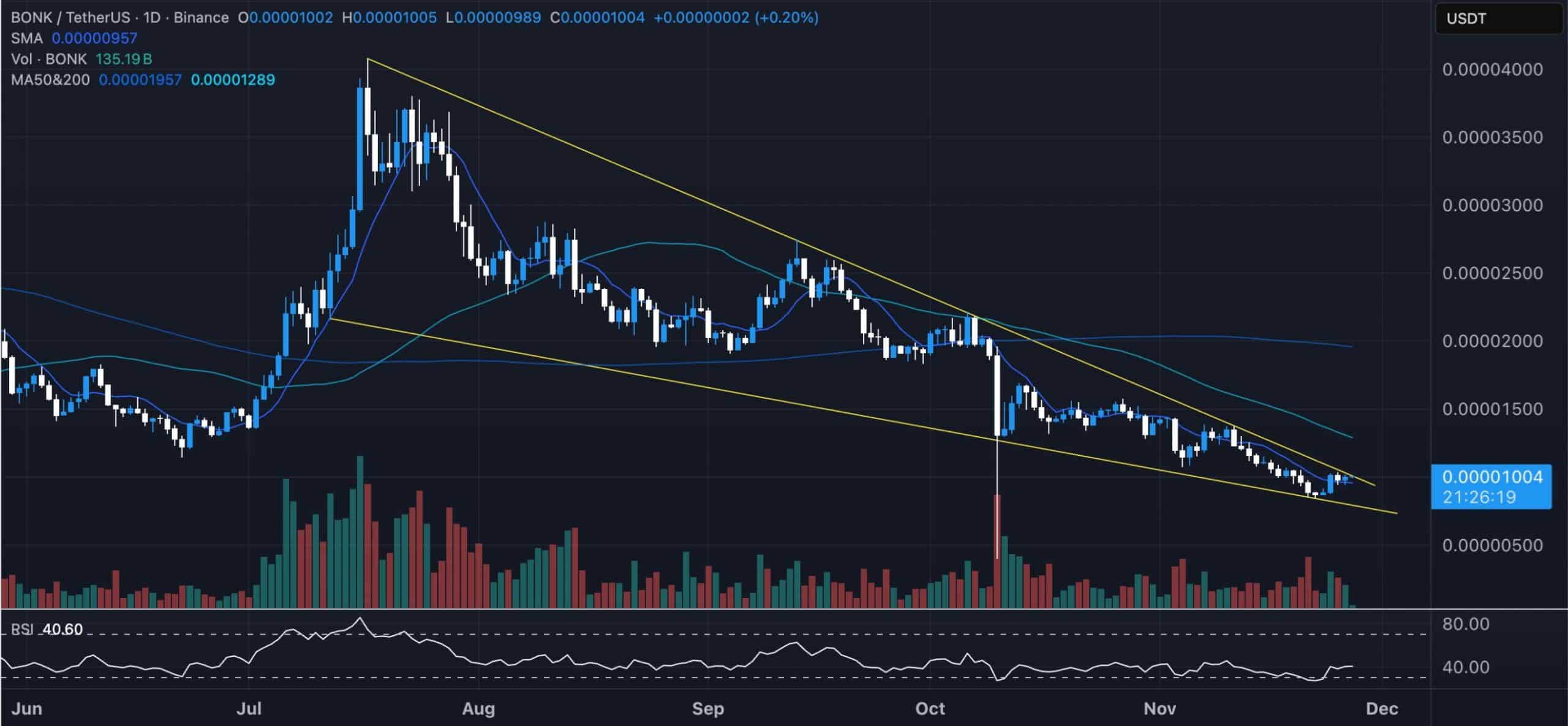 At the time the chart was shared, BONK was trading close to the top edge of a multi-month falling wedge.