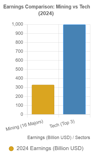 The financial chasm between mining and tech is evident in the latest data. In 2024, the top three tech giants collectively reported revenues exceeding $1 trillion, with Apple leading at $394 billion, Microsoft at $245 billion, and Nvidia at $96 billion, according to Statista. In contrast, the combined earnings of the 16 largest mining companies—spanning giants like BHP, Rio Tinto, and Vale—totaled approximately $330 billion, as per Mining Technology’s 2024 rankings. This figure represents just 33% of the tech trio’s haul, highlighting a market perception that prioritizes software and hardware over the raw materials that underpin them.