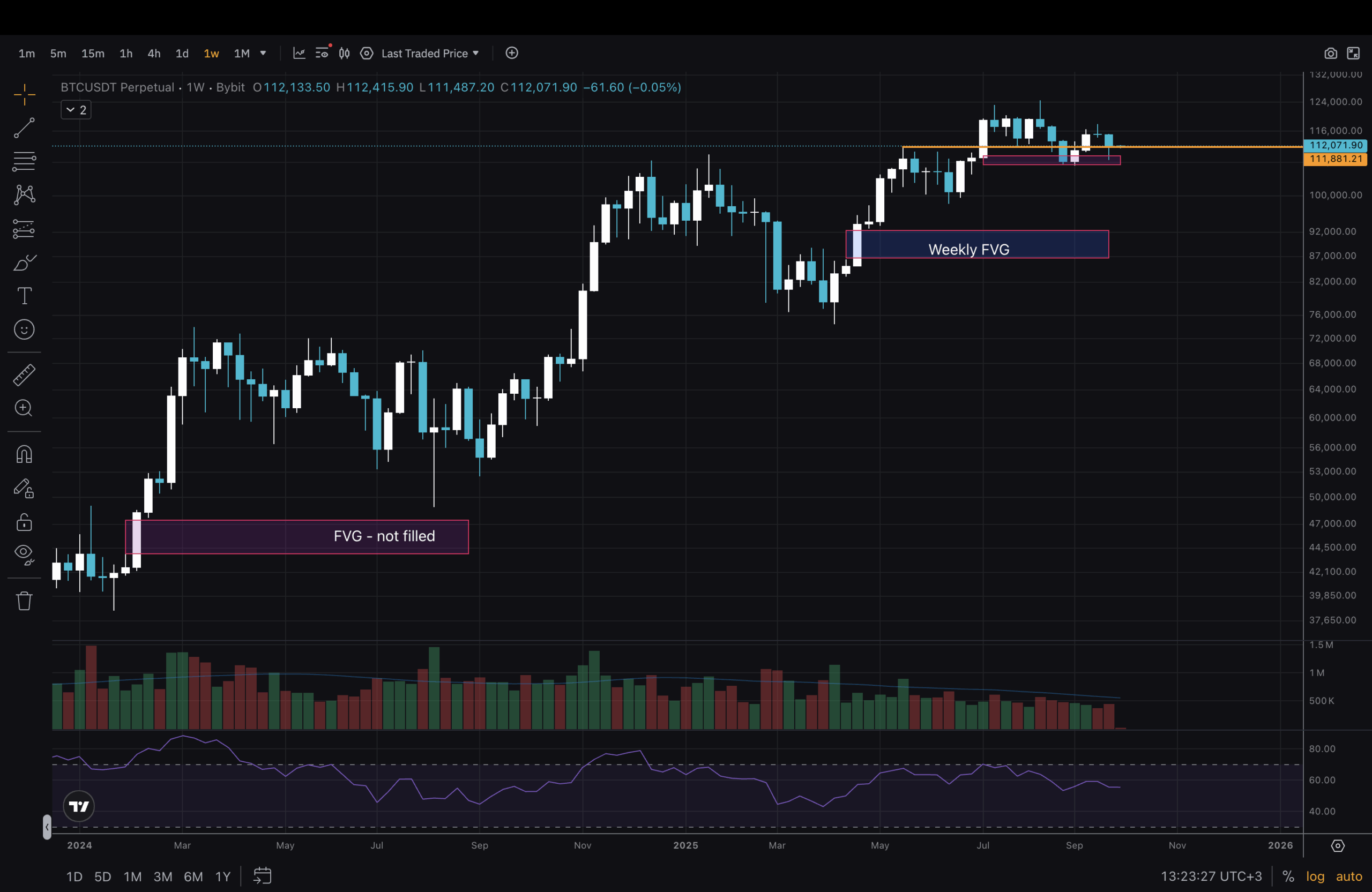 Going back to Sam’s comment on the importance of $112,000 level for Bitcoin price analysis, on this chart it is the orange line. And what is important here, besides that level, is last week’s candle. Half of the candle is a body, and half of it is a wick, with the wick being underneath that key level. This, by itself, could be a sign of strength!