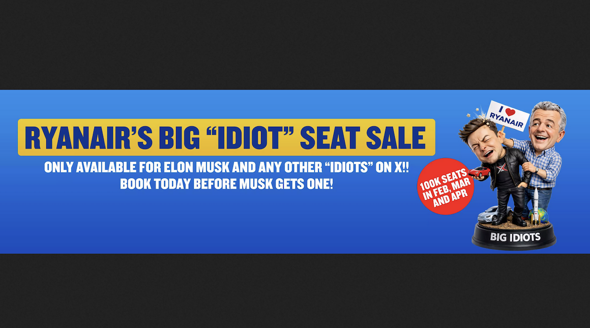 Of course, O’Leary has not responded in kind. Instead, he has responded by leveraging the entire exchange for publicity. On January 21, Ryanair announced a “Ryanair’s Big ‘Idiot’ Seat Sale” alongside a cartoon that shows O’Leary cutting in front of Musk to display an “I *heart* Ryanair” sign, with the following disclaimer (in all caps, of course):