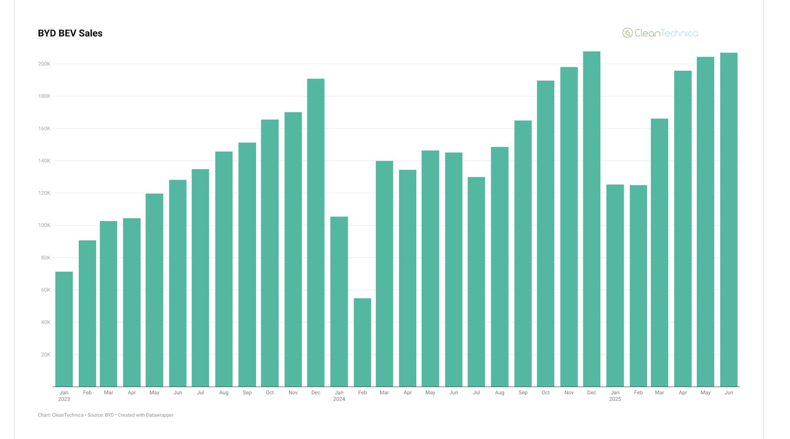 BYD’s plugin vehicle sales continue to increase. Like the overall EV market globally, and leading the overall EV market globally, BYD sales have been growing and growing and growing. After years of trailing Tesla but being by far the closest to the company in fully electric vehicle sales, BYD passed Tesla in the 4th quarter of 2024, and now it is zipping away from the US automaker at hyperspeed as Tesla sales drop and BYD sales keep on rising. Let’s jump into BYD’s June numbers for a closer look at the latter.