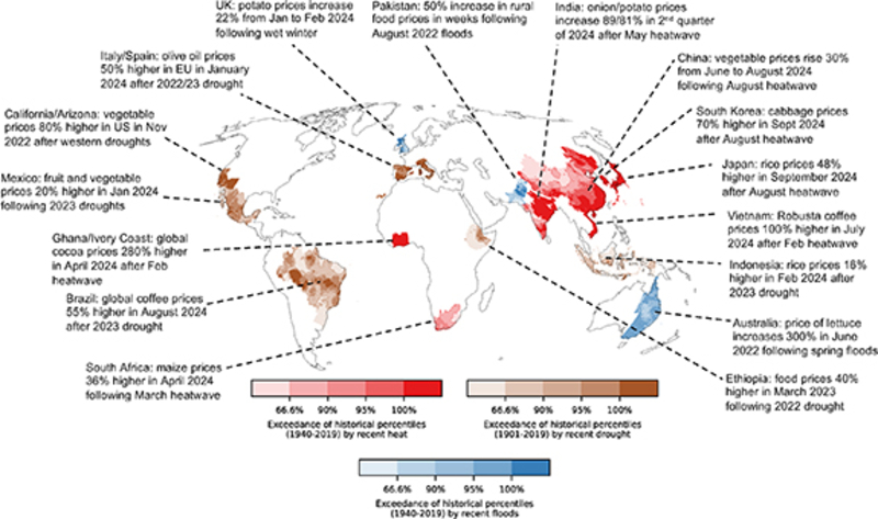 The researchers wrote, “We bring together reports by national and international media of food prices spiking in response to climate extremes across a range of countries to build a global picture. These reports typically rely on interviews with local producers, consumers and industry specialists in order to link price increases to recent weather conditions. As such, they provide a valuable narrative approach leveraging local knowledge to connect price changes with weather, which complements recent statistical analyses relying on a detailed causal modelling framework.”