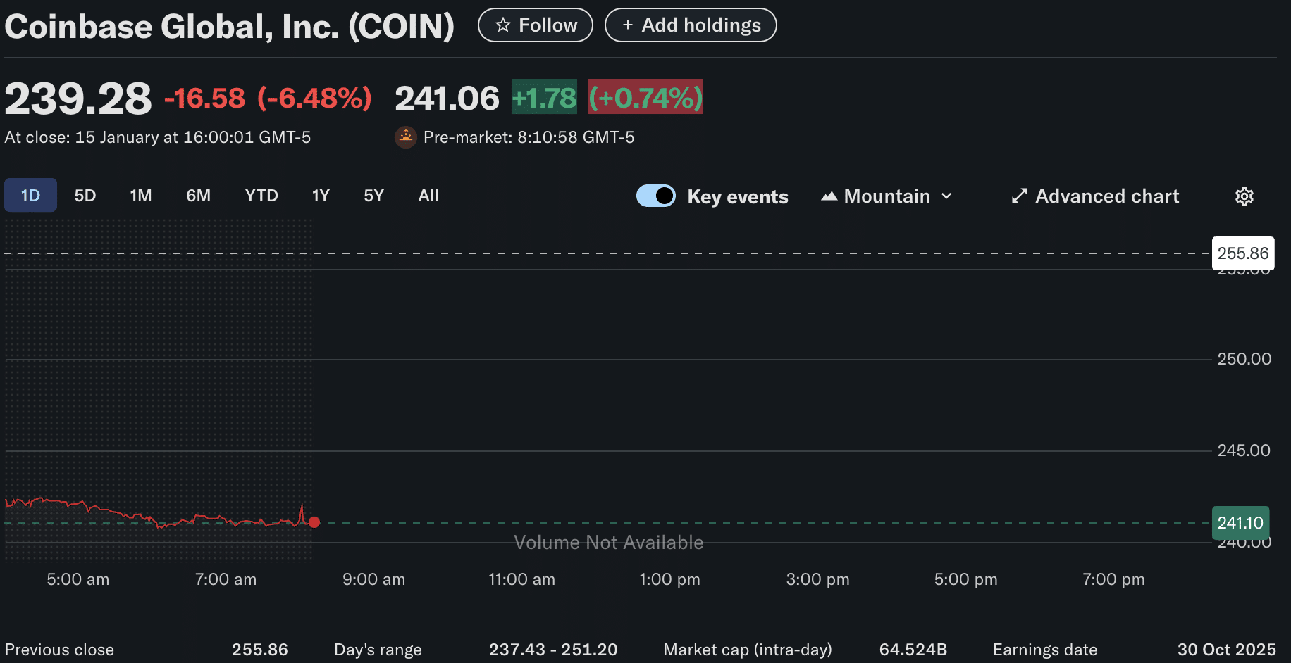 The market reacted fast. Coinbase (COIN) shares fell about -6.4%, and this spat comes at a sensitive moment, with Washington rewriting crypto rules and Wall Street racing to put real-world assets on blockchains.