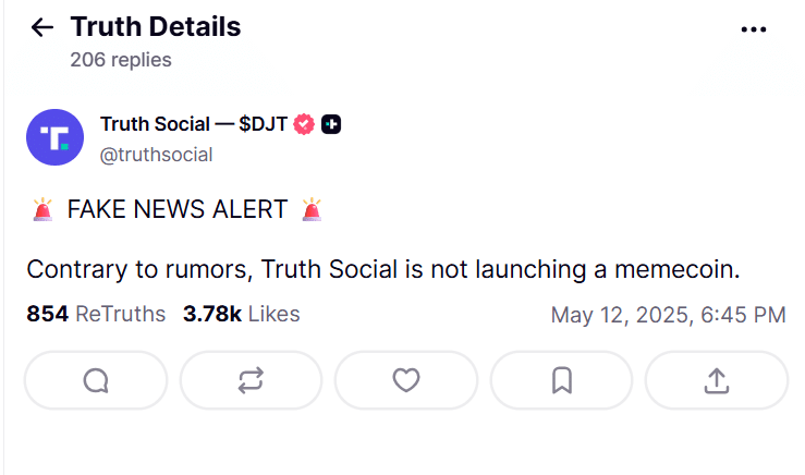 Speculation in May suggested that Trump Media might introduce a Truth Social memecoin, but the company dismissed those reports. Donald Trump Jr. publicly stated that there was “no truth” to the claims.