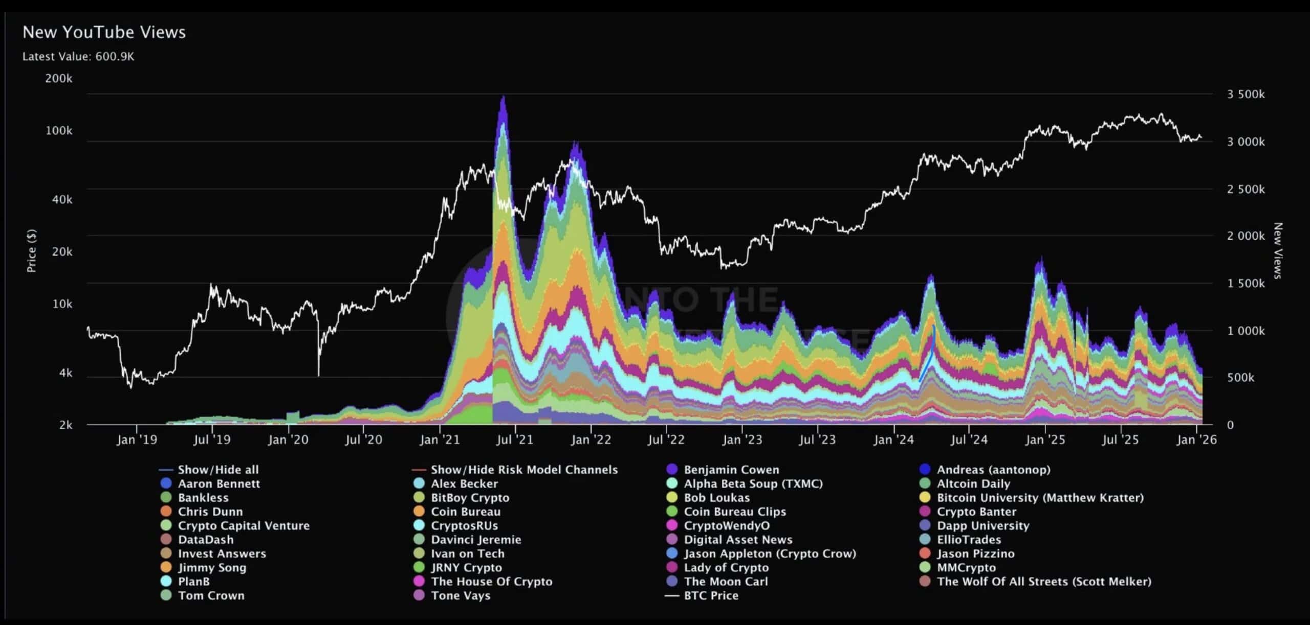 Historically, crypto YouTube once routinely pulled millions of views per day during speculative bull runs, serving as a proxy for retail excitement and FOMO. Today’s significantly lower view counts, even with Bitcoin near cycle highs, underscore that the narrative around crypto has lost its former viral pull.