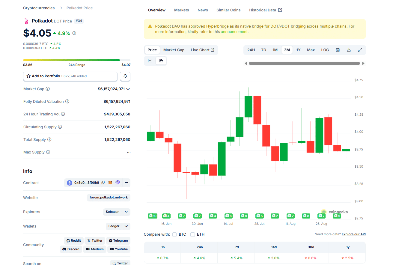 Coingecko data shows that Polkadot crypto has been stable in the past day and week, adding roughly +5%. At this pace, DOT USD is shaking off the weakness seen from mid-August 2025, finding a solid footing for possible gains.