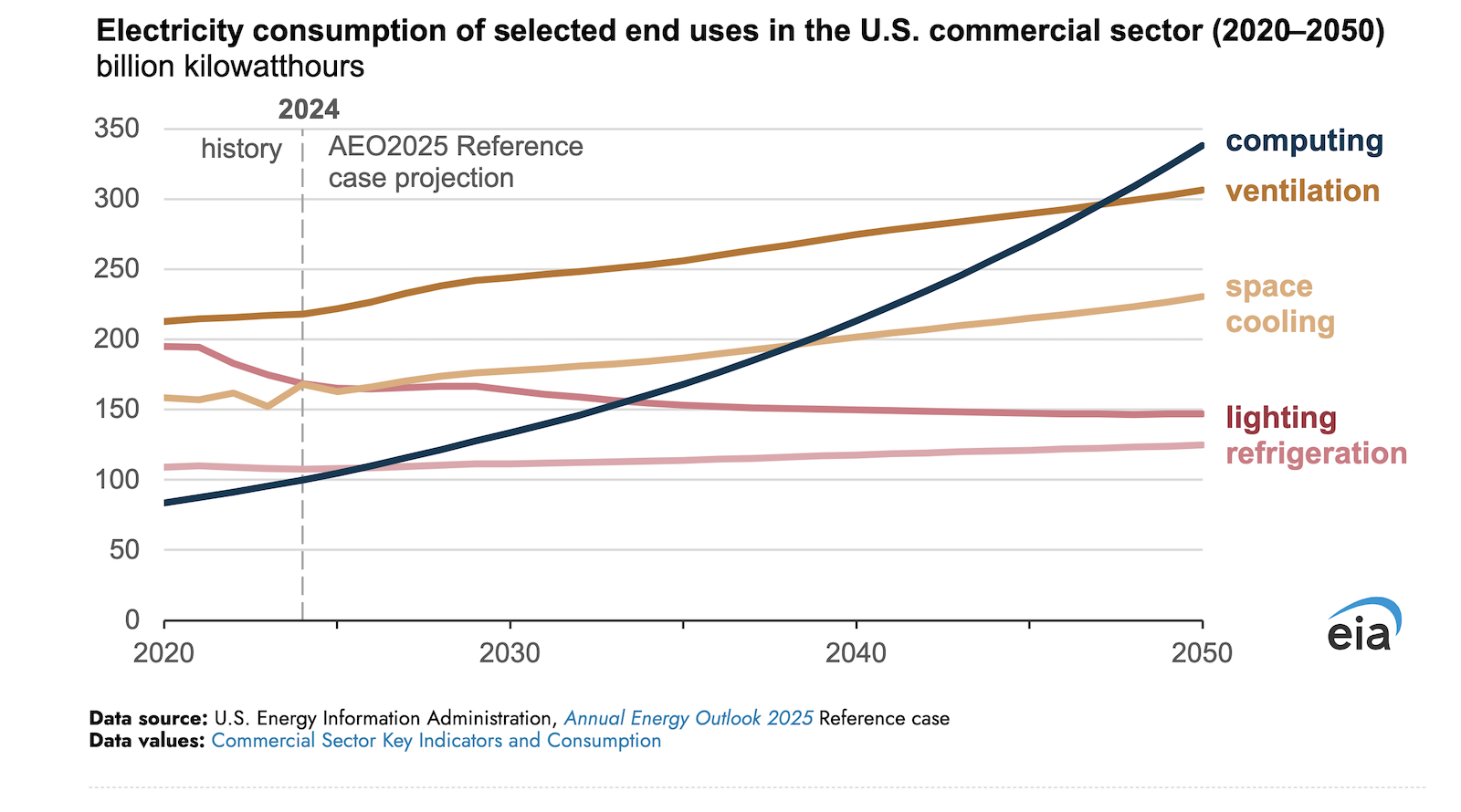 In our Annual Energy Outlook 2025 (AEO2025) Reference case, we project the electricity consumed for commercial computing will increase faster than any other end use in buildings. Computing accounted for an estimated 8% of commercial sector electricity consumption in 2024 and grows to 20% by 2050. Ultimately, more electricity could be consumed by computing than for any other end use in the commercial sector, including lighting, space cooling, and ventilation.