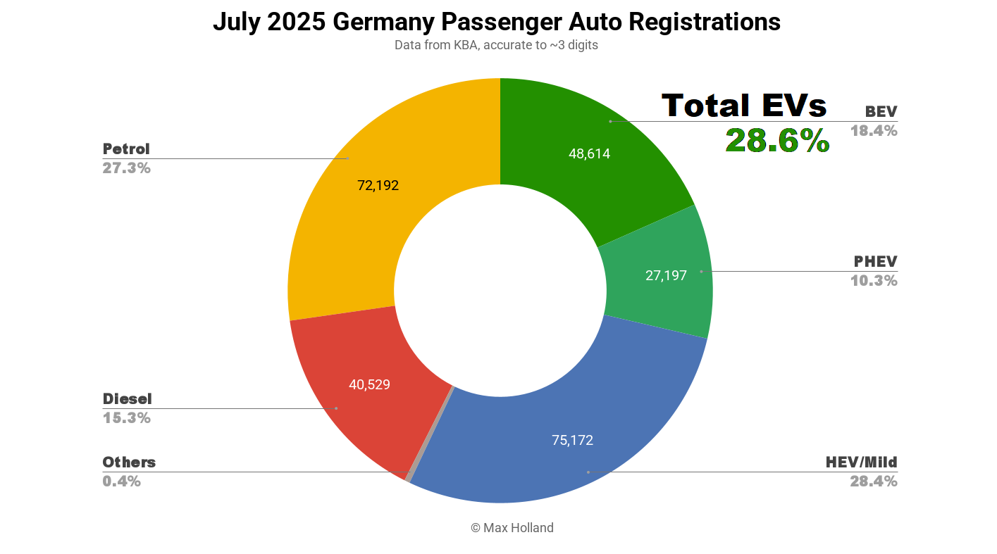 July’s auto sales saw combined EVs at 28.6% share in Germany, with full electrics (BEVs) at 18.4% share, and plugin hybrids (PHEVs) at 10.3%. These compare with YoY figures of 19.1% combined, 12.9% BEV, and 6.2% PHEV.