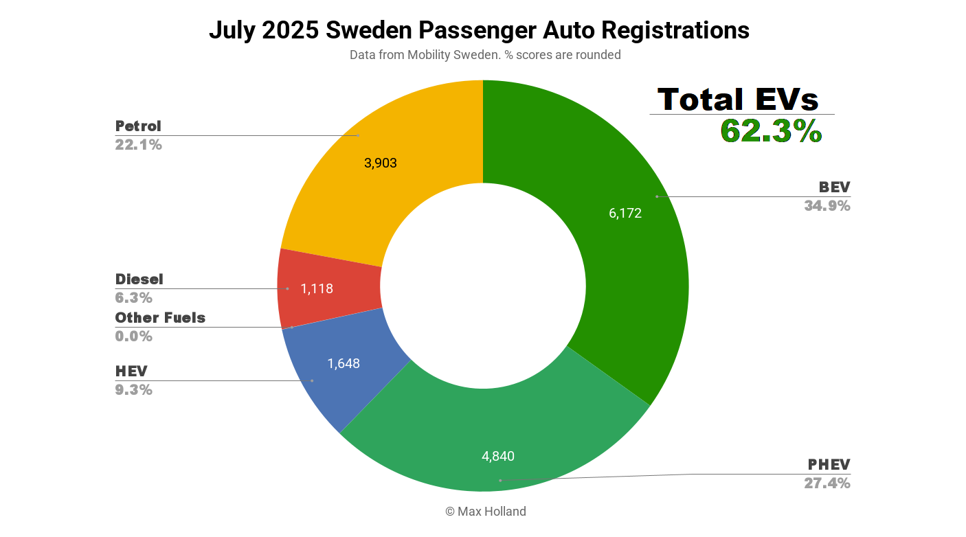 July’s auto sales showed combined plugin EVs at 62.3% share in Sweden, with full electrics (BEVs) at 34.9% and plugin hybrids (PHEVs) at 27.4%. These figures compare YoY against 59.6% combined, 33.8% BEVs and 25.8% PHEVs.