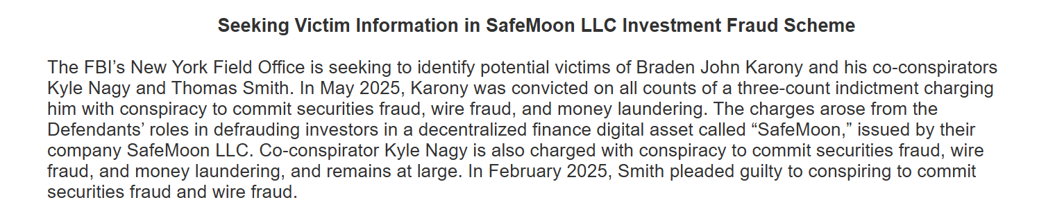 In May 2025, former SafeMoon CEO Braden John Karony was convicted on charges of conspiracy to commit securities fraud, wire fraud, and money laundering. Prosecutors said Karony and his partners misled investors throughout the 2021–2022 bull run, including false claims about executive access to SafeMoon’s liquidity pool and how those funds were being used.