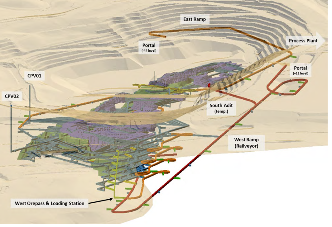 The West Ramp would have a decline from a portal located on surface outside of the existing open pit and adjacent to the proposed new processing facilities. This ramp has been designed for the installation of an electric powered ore hauling system, the Railveyor, and will also act as an emergency egress route from the mine. A third internal haulage ramp connects the West zone deep levels and the Railveyor West loading station at the 335 level with the main 185 level. The decline development plan enables the establishment of a primary ventilation circuit with no intermediate ventilation shafts required until the main ventilation infrastructure is developed.