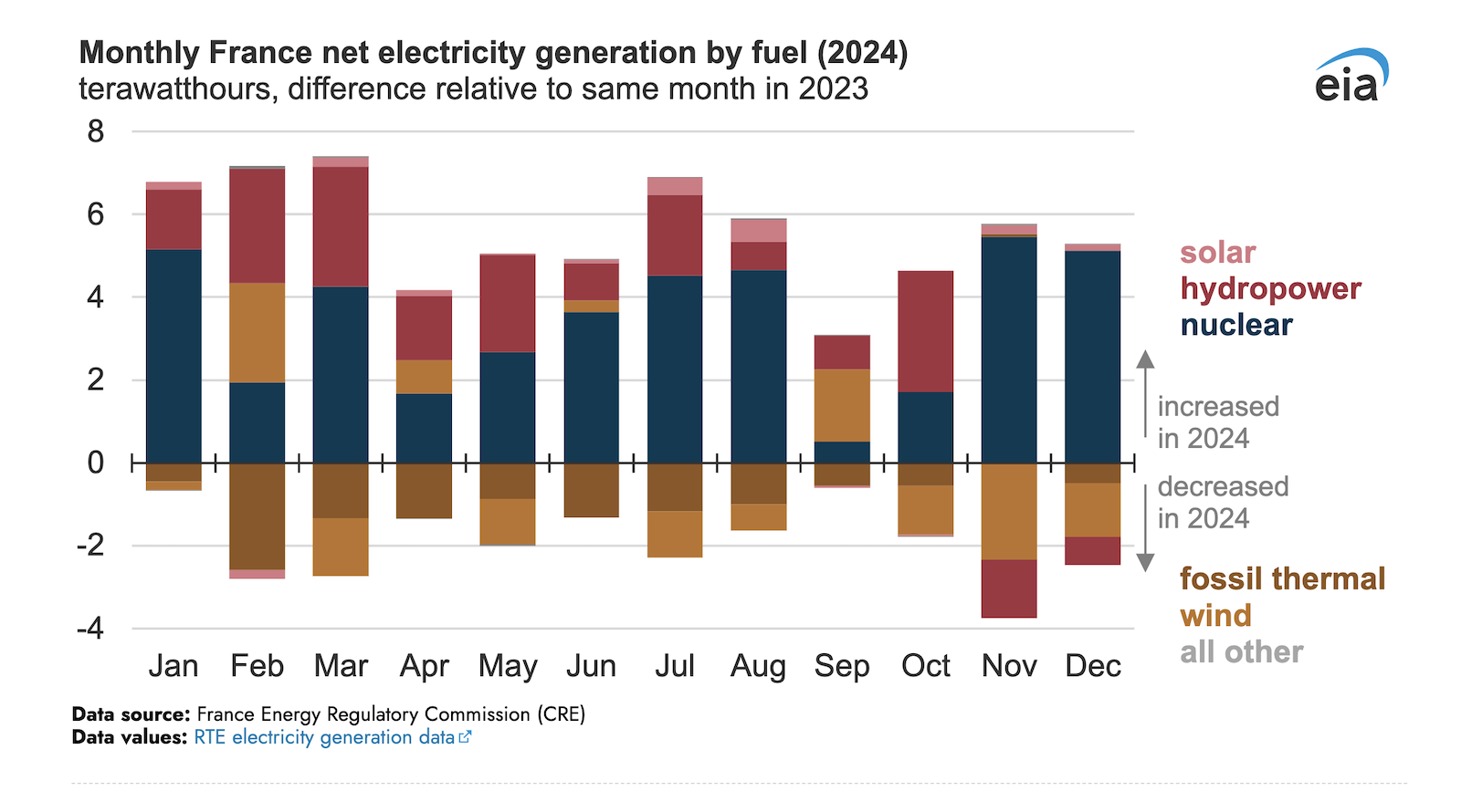Overall, electricity generation in France increased by 45 TWh in 2024, while consumption remained relatively steady. Nuclear energy generation increased the most, followed by hydropower, while wind and natural gas-fired generation decreased.