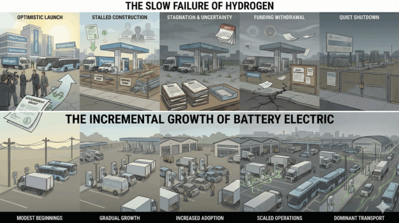 Across these cases, the underlying causes repeat. Hydrogen vehicles require expensive fueling infrastructure that cannot be justified without guaranteed throughput. Fleet operators will not commit without reliable infrastructure and predictable fuel pricing. Infrastructure investors will not build without fleet commitments. This circular dependency is not theoretical. It shows up in project after project. Public subsidies can delay the reckoning, but they cannot remove it. When grant milestones require binding commercial commitments, most hydrogen transport projects fail to meet them.