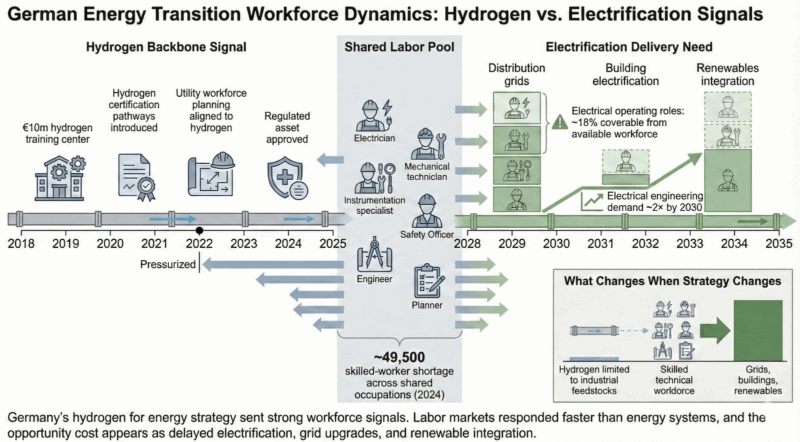 Energy strategies shape labor markets long before they deliver energy. Once a technology is designated as central in national plans, the effects propagate quickly through regulatory assumptions, funding programs, standards bodies, utilities, training institutions, and corporate planning cycles. Apprentices choose pathways that appear durable and mid career engineers invest time in reskilling toward systems that look politically protected. None of this requires speculation or ideological commitment. It is a rational response to credible signals. Germany’s hydrogen backbone sent one of the strongest possible signals, because it was not framed as a contingent option but as regulated, long lived national infrastructure with an assumed operating life measured in decades.