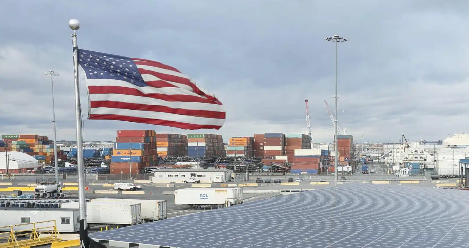 Photo (cropped): The Port Newark Container Terminal in New Jersey is now one of the few shipping hubs in the world to use on-site solar power to cut its own emissions (courtesy of Standard Solar).