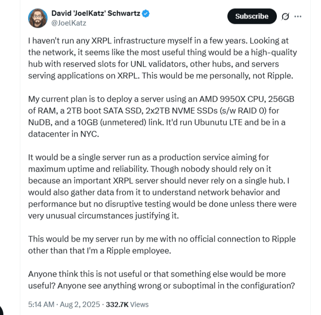On August 2, Schwartz announced on X that he independently built and launched a custom server in a New York data center, designed specifically to support the XRP Ledger without any ties to Ripple, the private company that operates several solutions, including On-Demand Liquidity, which relies on XRP on the XRP Ledger.Â