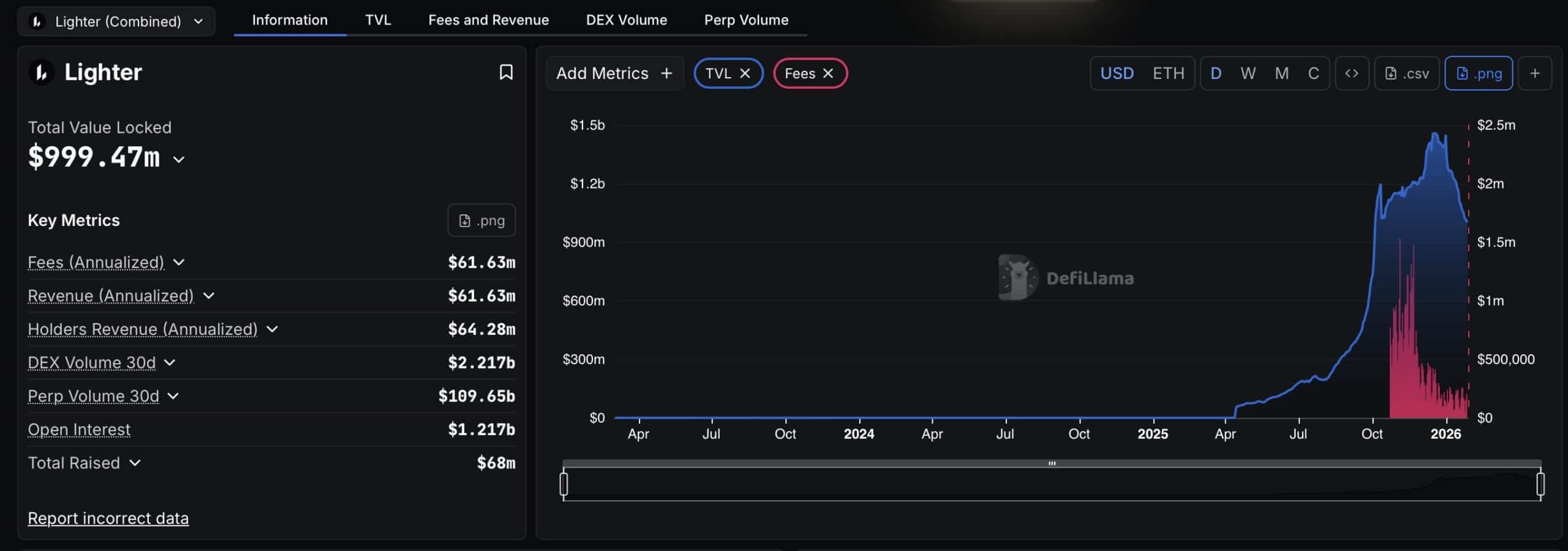 Annualized fees are currently around $61.6 million, closely matching protocol revenue. Total value locked (TVL) has risen to just under $1 billion. Trading activity is also high, with roughly $2.2 billion in DEX volume and over $109 billion in perpetual trading volume over the past 30 days.