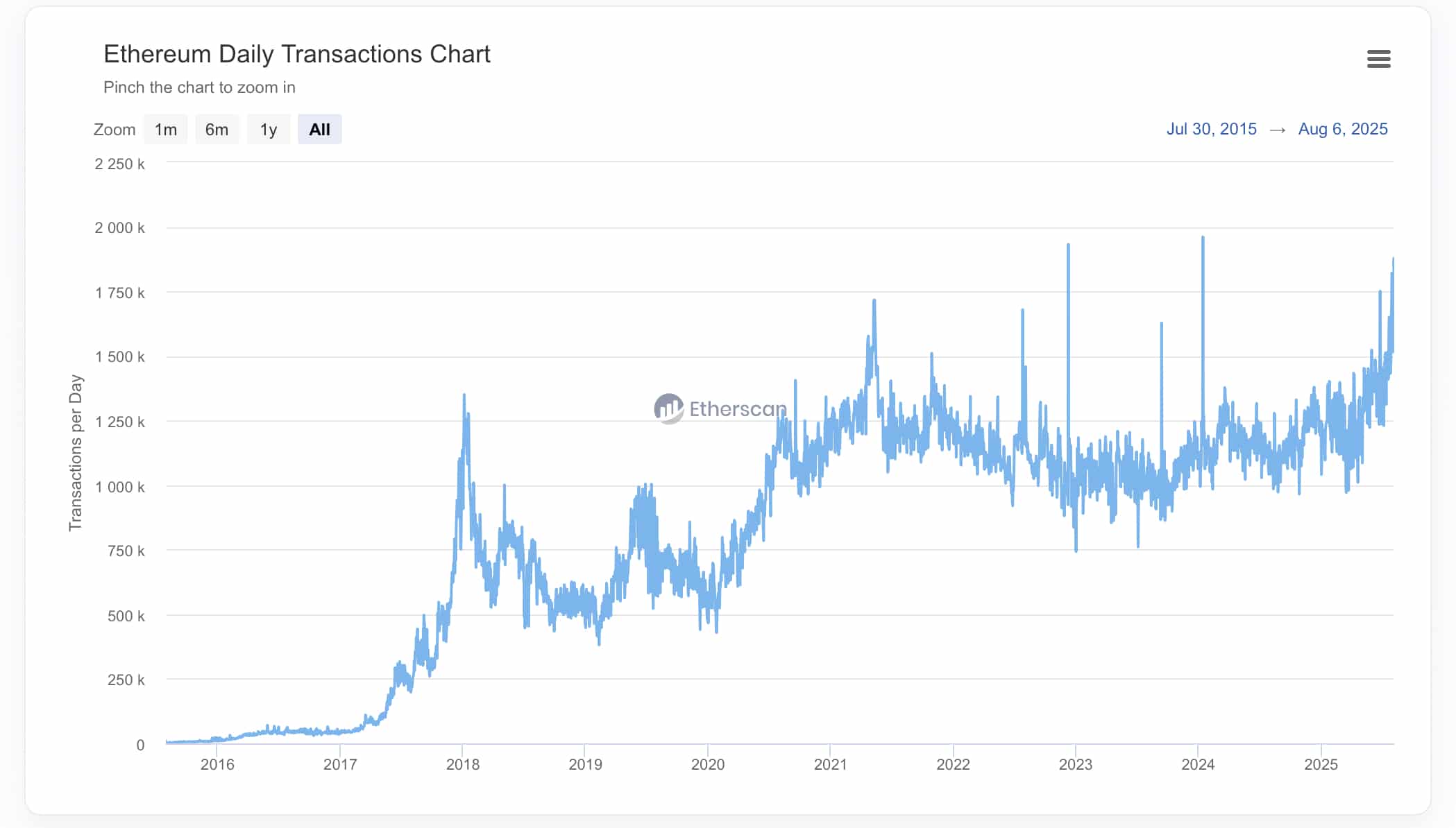 Ethereum network activity is also heating up. The network handled 1.87 million transactions yesterday, close to its all-time high. According to Nansen, much of this activity comes from USDC, Tether, and Uniswap.