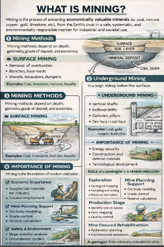 Mining is the process of extracting economically valuable minerals such as coal, iron ore, copper, gold, and limestone from the Earth’s crust. It is carried out in a planned, safe, and environmentally responsible way to meet industrial needs and support daily life. From electricity generation to construction and technology, mining forms the backbone of modern civilization.