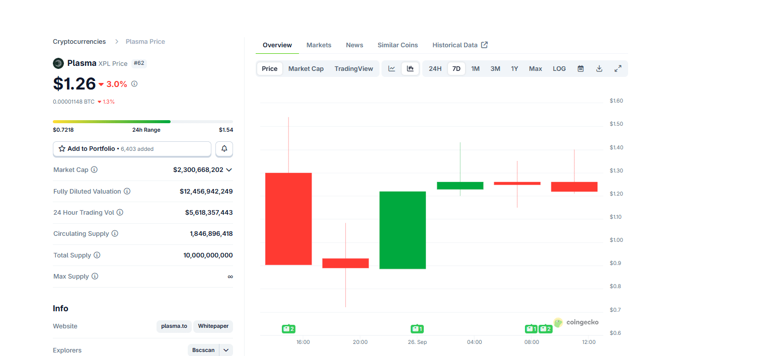 On Coingecko, XPL USD is holding firm above $1.20. Thanks to its explosive growth on September 25, its market cap has surged past $2.3 Bn, catapulting Plasma higher and cementing its position as one of the best cryptos to buy. More than 18 hours after launch, Plasma remains a trending topic, with trading volumes climbing steadily across major exchanges. This surge signals strong investor interest, even as the broader market grapples with a sell-off.