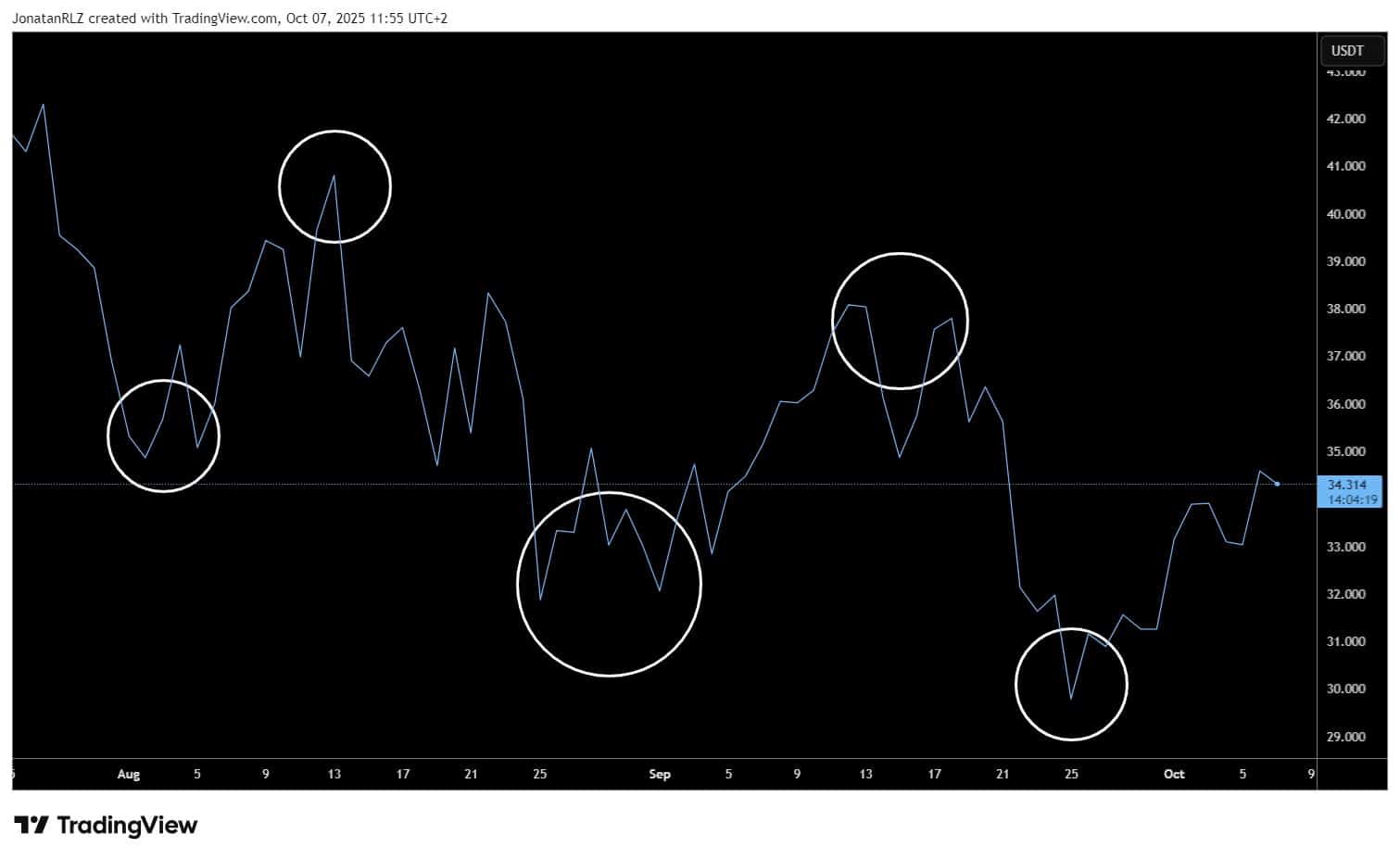 In the example below, the TRB chart is displayed in line format, with white circles marking each swing point. These are the same structural pivots that form the foundation for placing stop-losses based on price action.