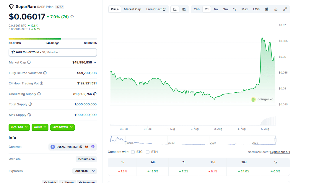 Data from Coingecko shows that RARE crypto shot 35% yesterday, reversing last week’s losses and adding nearly 20% in the past week.
