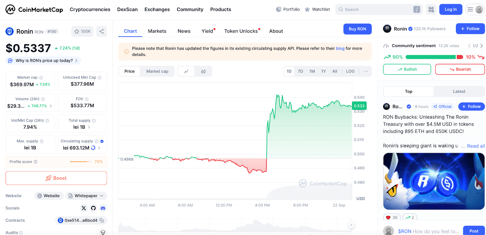 Ronin fits that theme. The blockchain gaming network plans to start about $4.5M in RON buybacks on September 29.