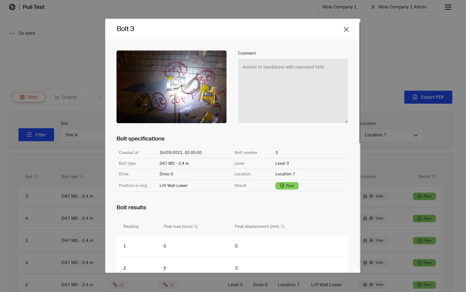 With a standardised reporting system, customers gain access to a comprehensive database of pull test data showing all their mining sites in one system. It includes grouping and filtering options, detailed load-displacement plots and the ability to add comments and images to individual reports.