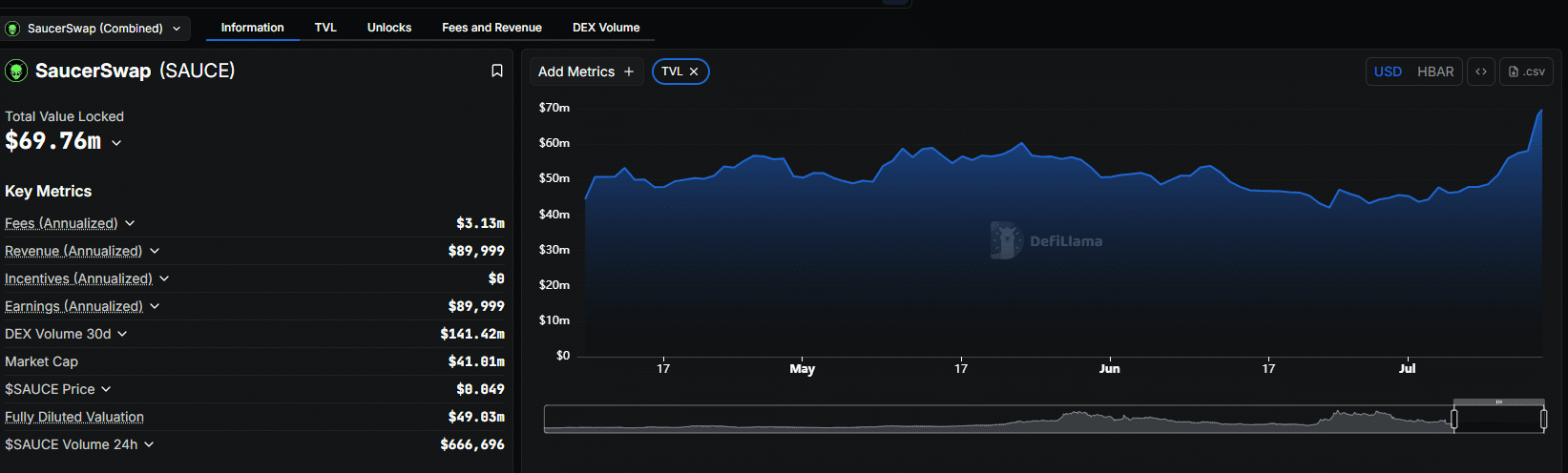 By July 14, 2025, SaucerSwap’s assets under management stood at nearly $70 million, pushing its revenue in 2025 even higher.