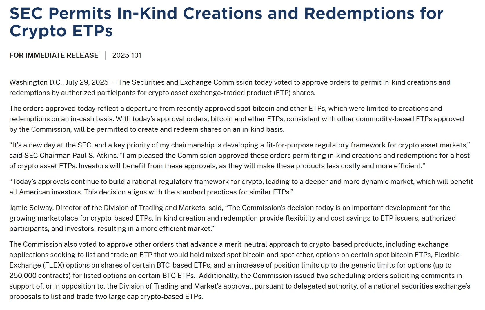 - The SEC now allows in-kind redemptions for spot Bitcoin and Ethereum ETFs, letting issuers directly move crypto instead of using cash.