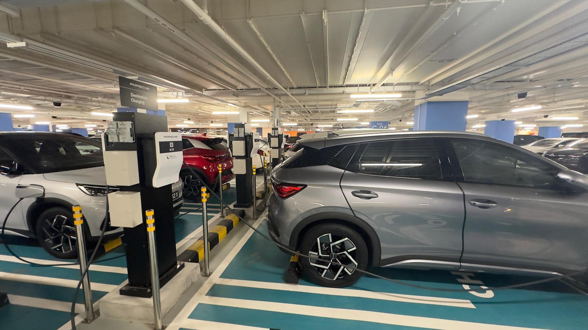 As I left the airport to the city, riding in a Toyota Prius Hybrid which I booked on the Grab app, the first thing I noticed in the Terminal 3 parking lot was the presence of more electric vehicle chargers — a total of six 22 kW chargers in one section. These are owned by SP Mobility, which also operates six more charging points at Terminal 1, home to the famous Jewel.