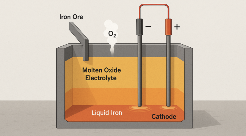 Molten oxide electrolysis is, at its core, electrochemical smelting. Instead of chemically reducing iron ore with carbon-based reductants like coal, coke, or natural gas, it directly reduces iron oxide to metallic iron using electrons provided through electrical current. In a molten electrolyte bath at roughly 1600°C, iron oxide — rusted iron — dissociates into molten iron and oxygen gas. The cathode reaction sees iron ions accept electrons and deposit as liquid iron metal, while the anode emits pure oxygen gas as oxide ions release electrons.