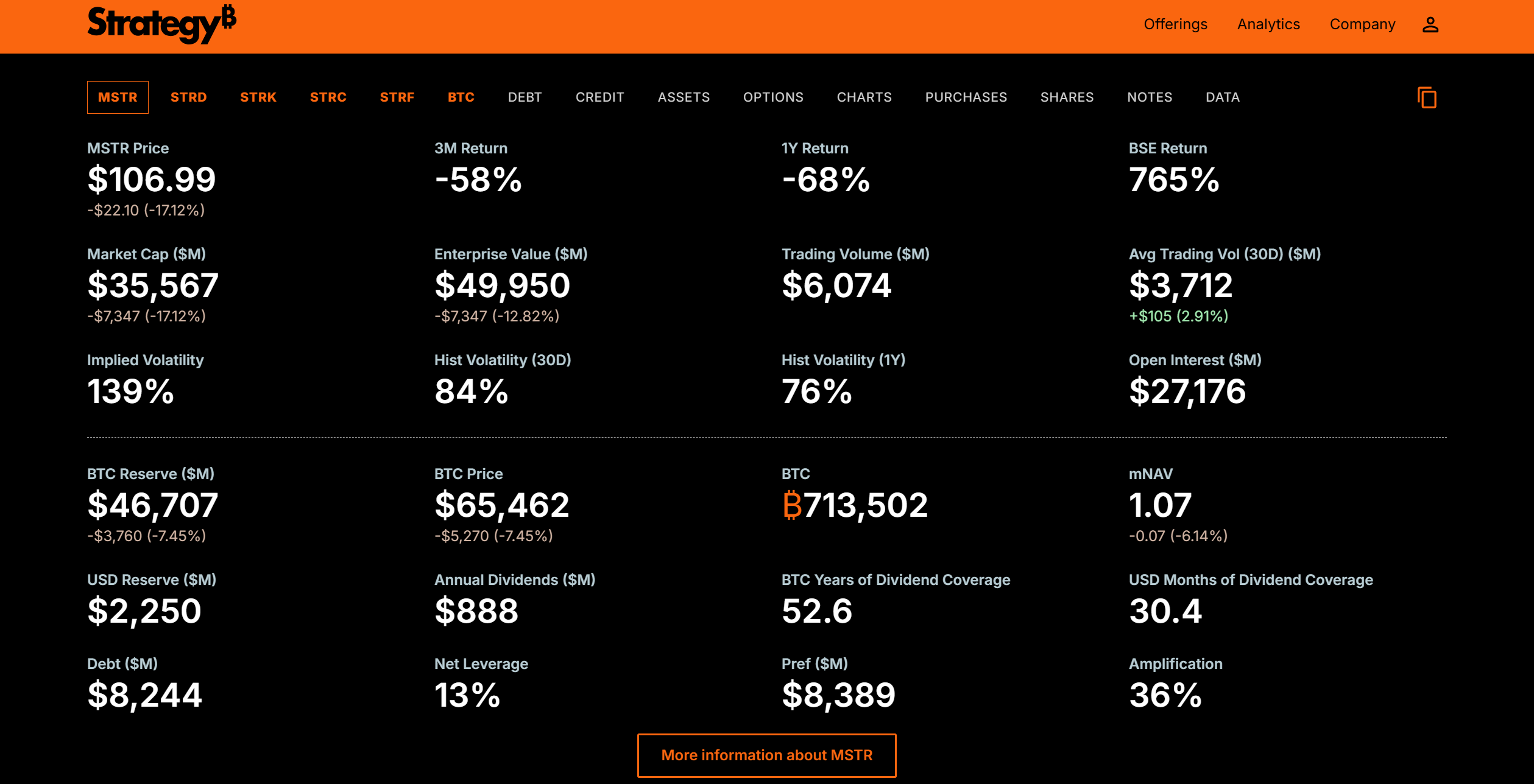 That structure explains the sharp swings. MSTR tends to follow Bitcoin closely but amplifies the moves because the company used debt to acquire additional coins. When BITCOIN USD drops by a few percent, Strategy often falls further because investors factor in leverage and risk.