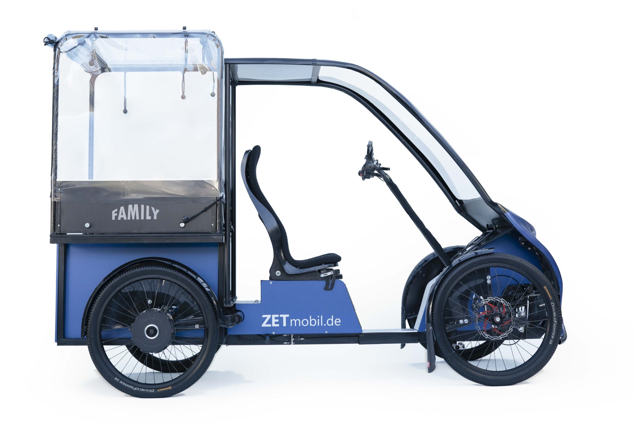 • Family: A covered cabin with seating for up to four children, weather protection, safety belts, and even storage — like a minivan, only greener.