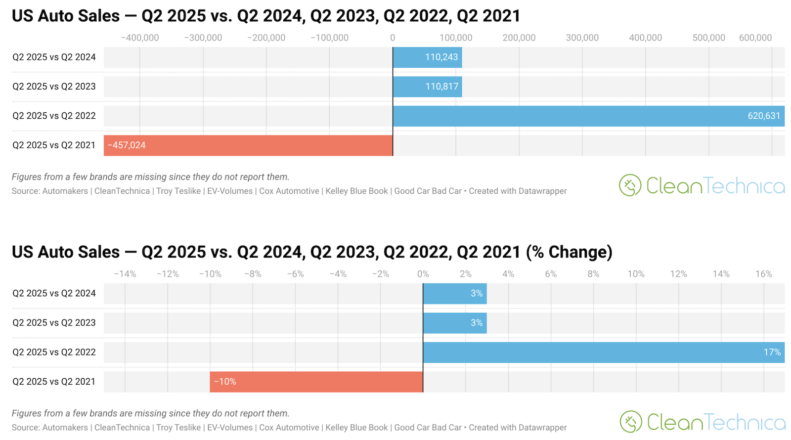 Overall, US auto sales were up 3% in Q2 2025 compared to Q2 2024, and also up 3% in Q2 2025 compared to Q2 2023. That’s much different from the first two post-COVID years of 2021 (down 10%) and 2022 (up 17%). Naturally, markets were quite warped for a while, especially with supply chain challenges in the auto industry related to Russia’s invasion of Ukraine as well as the COVID crisis.