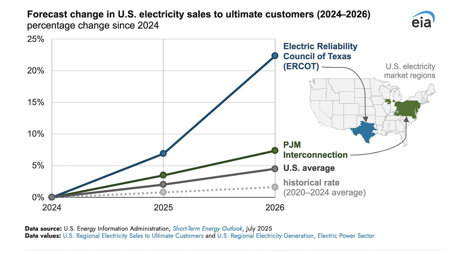 In our most recent Short-Term Energy Outlook (STEO), we forecast nationwide U.S. retail electricity sales to ultimate customers will grow at an annual rate of 2.2% in both 2025 and 2026, compared with average growth of 0.8% between 2020 and 2024. The forecast reflects rapid electricity demand growth in Texas and several mid-Atlantic states, where the grid is managed by the Electric Reliability Council of Texas (ERCOT) and the PJM Interconnection, respectively. We expect electricity demand in ERCOT to grow at an average rate of 11% in 2025 and 2026 while the PJM region grows by 4%.