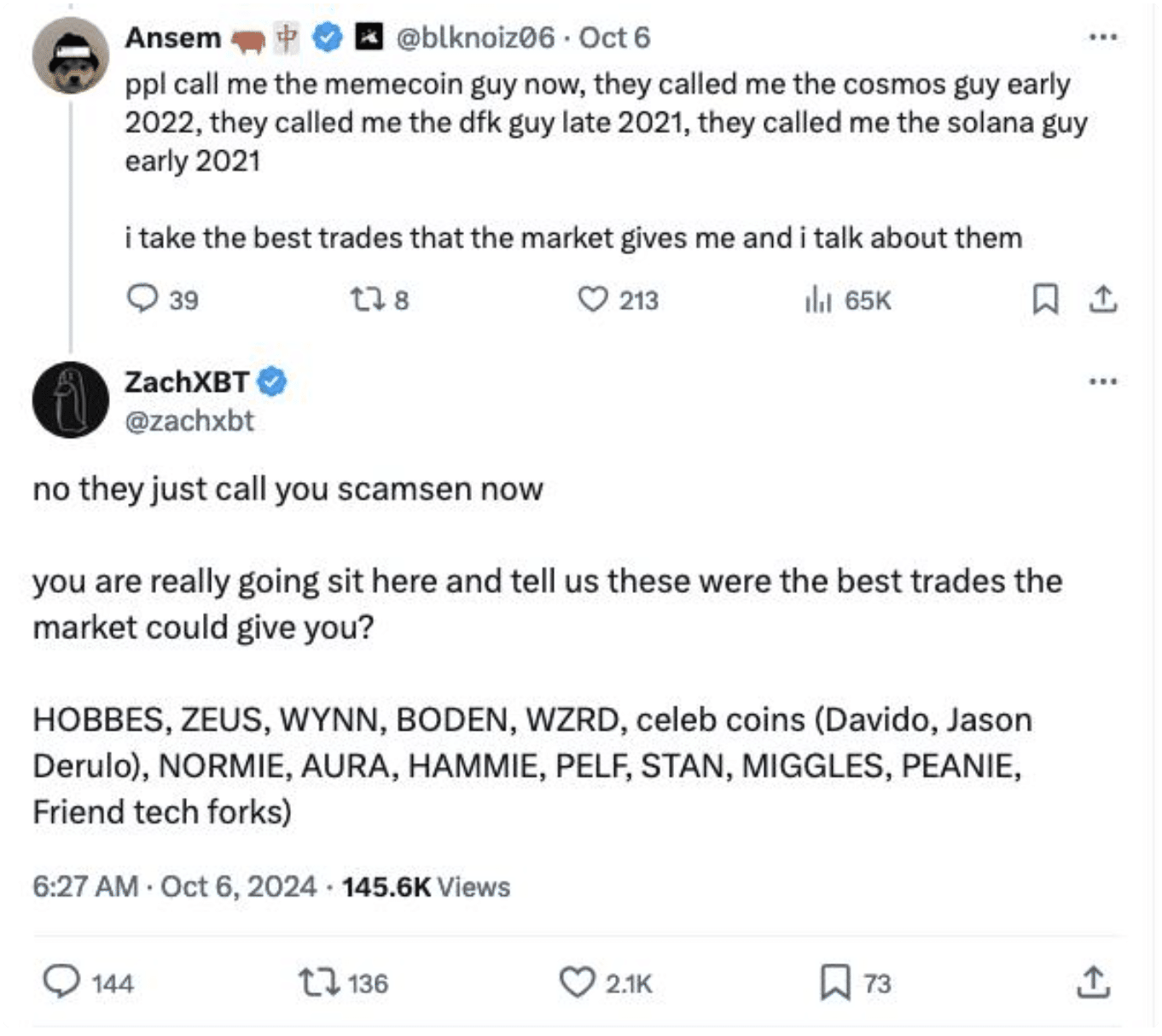 Zion has been criticized in the past for pumping and dumping illiquid, low-market-cap tokens, even drawing the ire of notorious on-chain sleuth ZachXBT. In October 2024, Zach called Ansem crypto out in a post aimed at another notable influencer, Murad.