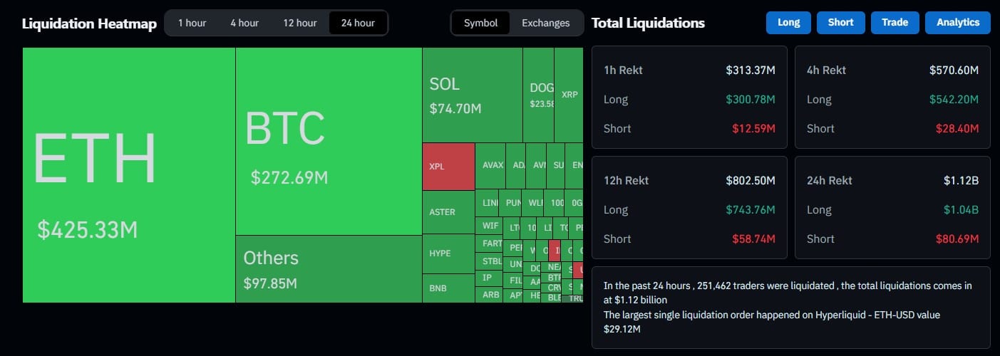 However, ETH is leading the liquidation numbers with $425M long liquidations over the $272M BTC. More than 250.000 traders were liquidated, with the largest single liquidation happening on Hyperliquid, an ETH-USD pair with a value of $29.12 million.