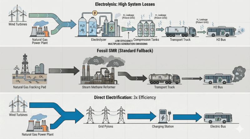 The persistence of tailpipe based policy frameworks allowed these outcomes to repeat. Hydrogen buses qualified as zero emissions vehicles regardless of how hydrogen was produced or delivered. Transit agencies responded rationally to incentives as written. The problem was not intent. It was metrics. Once upstream emissions, leakage, and energy losses are included, hydrogen transit no longer fits the category it was assigned.